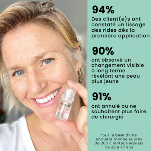 Après-soin : Appliquez l’excédent de sérum sur votre visage et laissez-le pénétrer pendant la nuit. Évitez le maquillage ou l’exposition au soleil pendant 24h. Vous pouvez, si vous le souhaitez, poursuivre avec votre routine de soins habituelle.